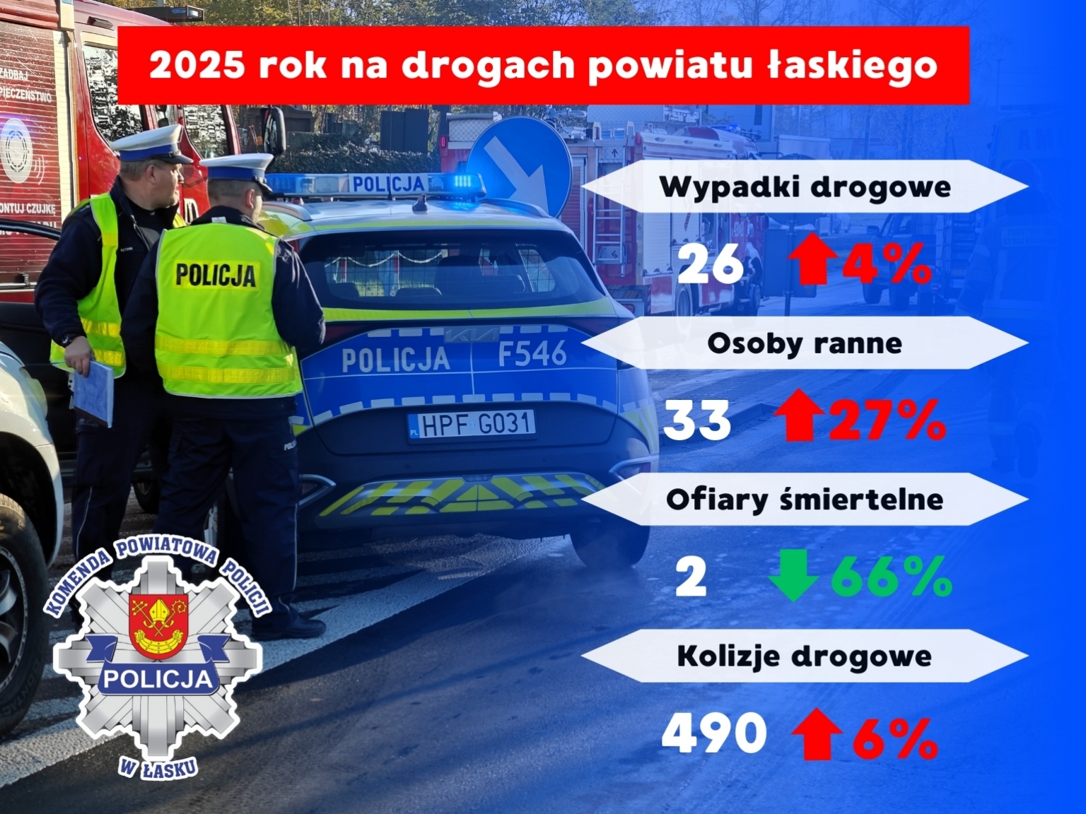 Rok 2025 na drogach powiatu łaskiego przyniósł znaczącą poprawę w zakresie najtragiczniejszych zdarzeń – odnotowaliśmy spadek liczby ofiar śmiertelnych aż o 66%. Mimo tego pozytywnego trendu, ogólna liczba zdarzeń drogowych oraz osób rannych uległa zwiększeniu.