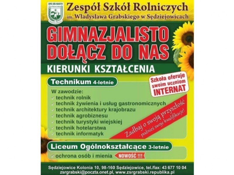 Zespół Szkół Rolniczych im. Władysława Grabskiego w Sędziejowicach zaprasza