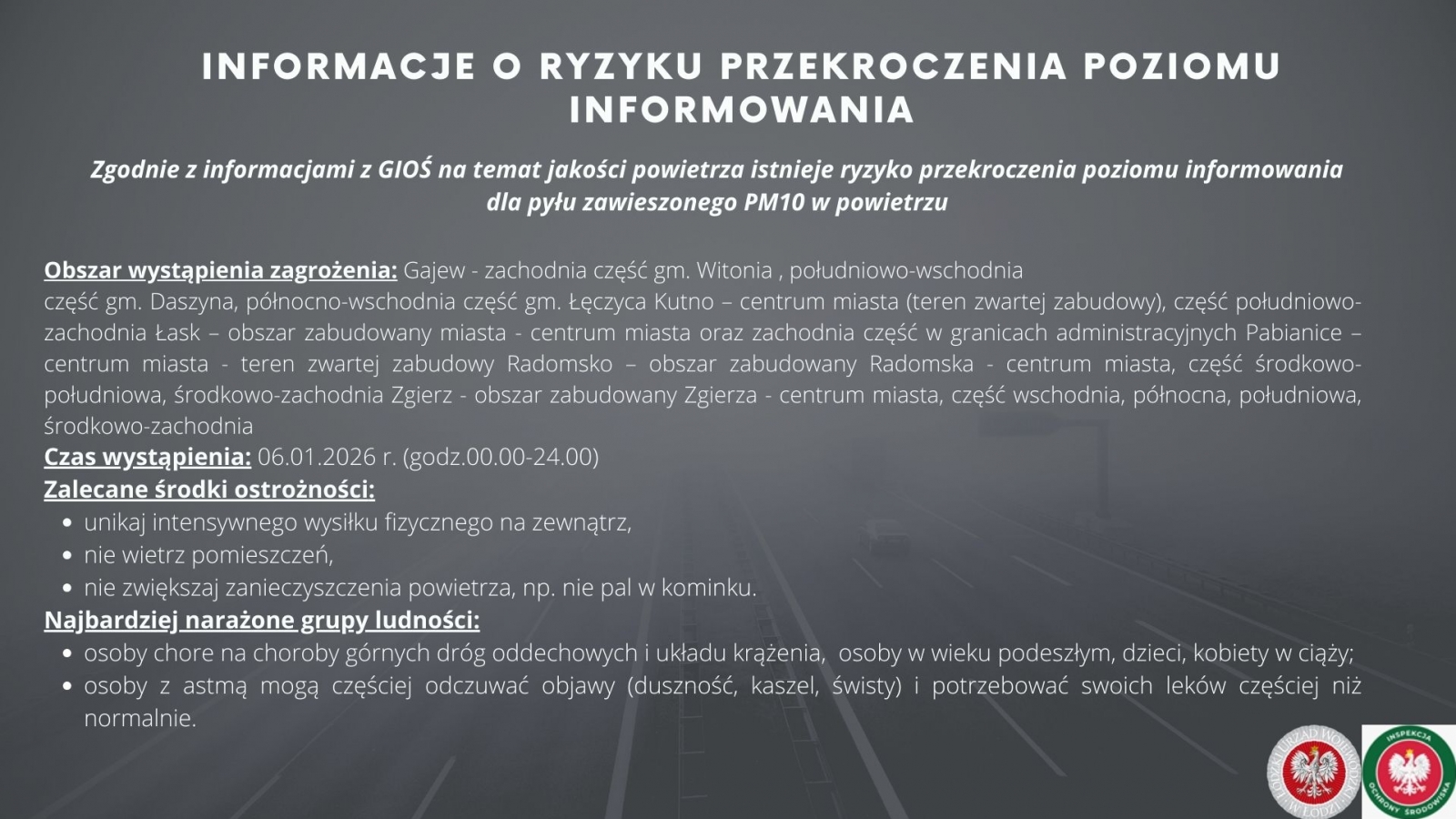 UWAGA! Powiadomienie o ryzyku wystąpienia przekroczenia poziomu informowania dla pyłu zawieszonego PM10 w powietrzu. Zagrożenie: Ryzyko wystąpienia przekroczenia poziomu informowania (100 μg/m3) dla pyłu zawieszonego PM10 w powietrzu