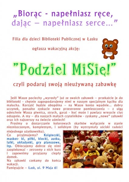 Filia dla dzieci Biblioteki Publicznej w Łasku ogłasza wakacyjną akcję „Podziel MiSię”, czyli podaruj swoją nieużywaną zabawkę!