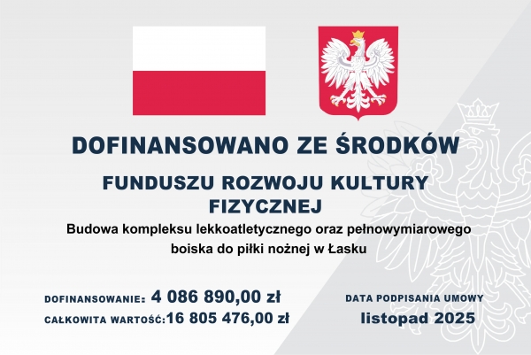Informujemy, iż Gmina Łask w dniu 06.11.2025 r. podpisała umowę o dofinansowanie ze środków Funduszu Rozwoju Kultury Fizycznej zadania inwestycyjnego w ramach Programu Rozwoju Infrastruktury Sportowej w Województwach – Edycja 2025 nr 2025/0626/3179/SubA/DIS/ISW na realizację projektu pn. „Budowa kompleksu lekkoatletycznego oraz pełnowymiarowego boiska do piłki nożnej w Łasku”.