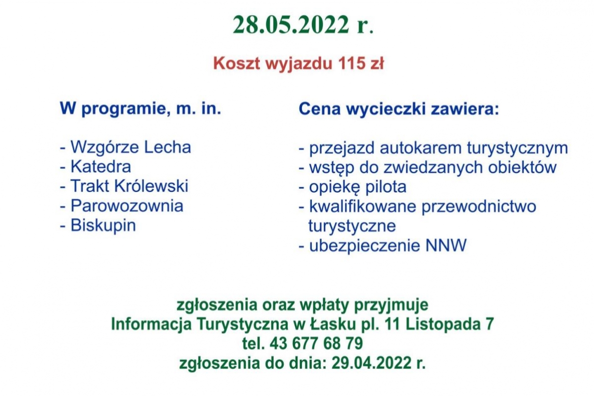 Biblioteka Publiczna im. Jana Łaskiego Młodszego w Łasku - Informacja Turystyczna z okazji 600-lecia nadania praw miejskich dla Łasku organizuje jednodniową wycieczkę do Gniezna - miejsca pochówku Jana Łaskiego arcybiskupa gnieźnieńskiego i prymasa Polski. Wycieczka odbędzie się 28 maja 2022 r. Koszt wyjazdu: 115 zł.