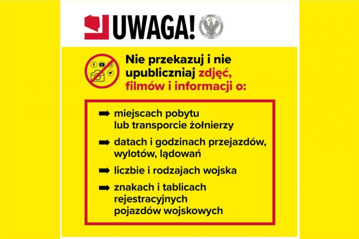 Prosimy wszystkich aby nie publikować informacji i zdjęć obrazujących ruchy wojsk i ich lokalizację, dat i godzin przejazdów kolumn wojskowych danych dotyczących wylotów i lądowań wojskowych statków powietrznych. Bądźmy świadomi zagrożeń!