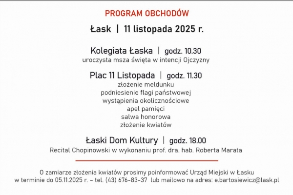 Zapraszamy na uroczyste obchody Narodowego Święta Niepodległości w Łasku. 11 listopada 2025 r. będziemy świętować 107. rocznicę odzyskania przez naszą Ojczyznę niepodległości. Zachęcamy mieszkańców, aby wywiesili flagi państwowe, a na uroczystości zabrali ze sobą symbole narodowe.