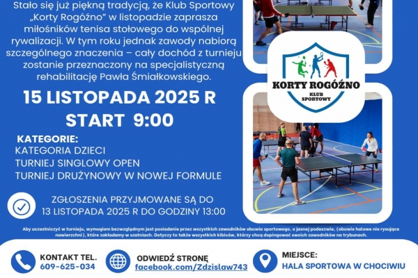 Stało się już piękną tradycją, że Klub Sportowy „Korty Rogóźno” w listopadzie zaprasza miłośników tenisa stołowego do wspólnej rywalizacji. W tym roku jednak zawody nabiorą szczególnego znaczenia – cały dochód z turnieju zostanie przeznaczony na specjalistyczną rehabilitację Pawła Śmiałkowskiego. Turniej odbędzie się 15 listopada 2025 roku (sobota) w sali sportowej Szkoły w Chociwiu. Rozpoczęcie zaplanowano na godzinę 9:00.