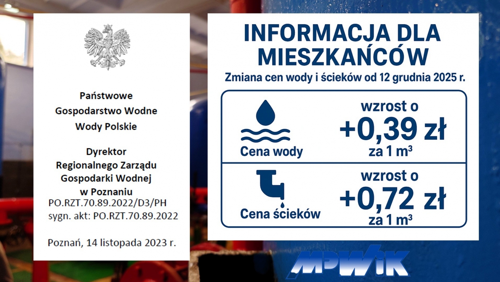 Zmiana taryf zostaje wprowadzona na podstawie Decyzji Dyrektora Regionalnego Zarządu Gospodarki Wodnej w Poznaniu PGW Wody Polskie z dnia 14 listopada 2023 r. nr PO.RZT.70.89.2022_D3_PH.