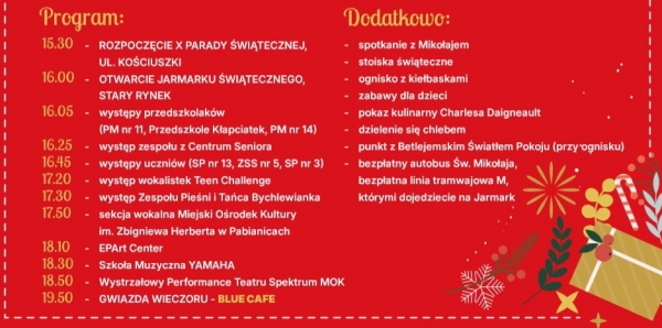 Uczestnicy parady ustawią się o godzinie 15.15 na ul. Kościuszki, za Urzędem Miejskim. O godzinie 15.30 rozpocznie się przemarsz ul. Zamkową na Stary Rynek, w którym weźmie udział 15 grup zorganizowanych z pabianickich firm, szkół i stowarzyszeń. Jarmark Świąteczny na Starym Rynku rozpocznie o godz. 16.00. Na scenie wystąpią przedszkolaki z PM nr 11, PM nr 14 i Przedszkola Kłapciatek, zespół z Centrum Seniora, uczniowie SP nr 13, ZSS nr 5 i SP nr 3, wokalistki z Teen Challenge, Zespół Pieśni i Tańca Bychlewianka, sekcja wokalna Miejskiego Ośrodka Kultury, EPArt Center, Szkoła Muzyczna YAMAHA, Teatr Spektrum i o godz. 19.50 gwiazda wieczoru – BLUE CAFE.