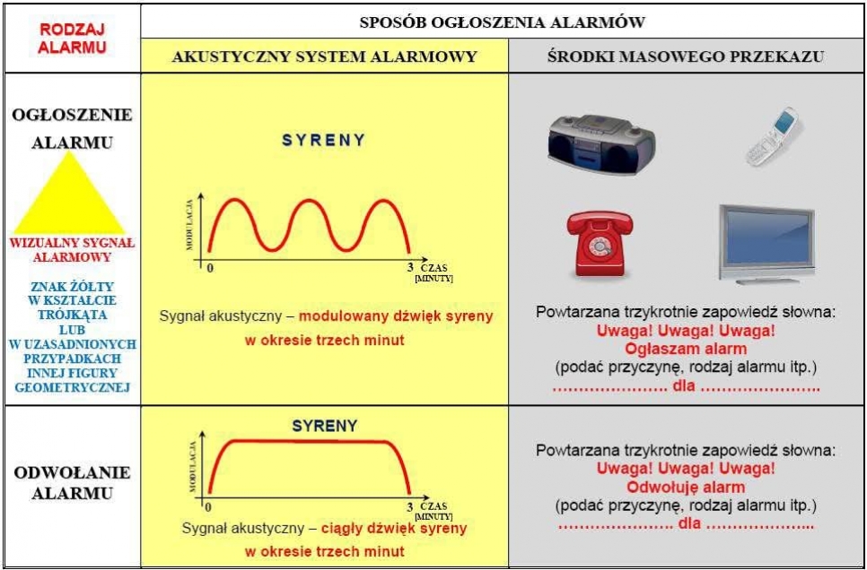 Sygnał akustyczny – trzykrotnie wzrastający i opadający dźwięk syreny alarmowej z przerwami 30-sto sekundowymi trwający trzy minuty