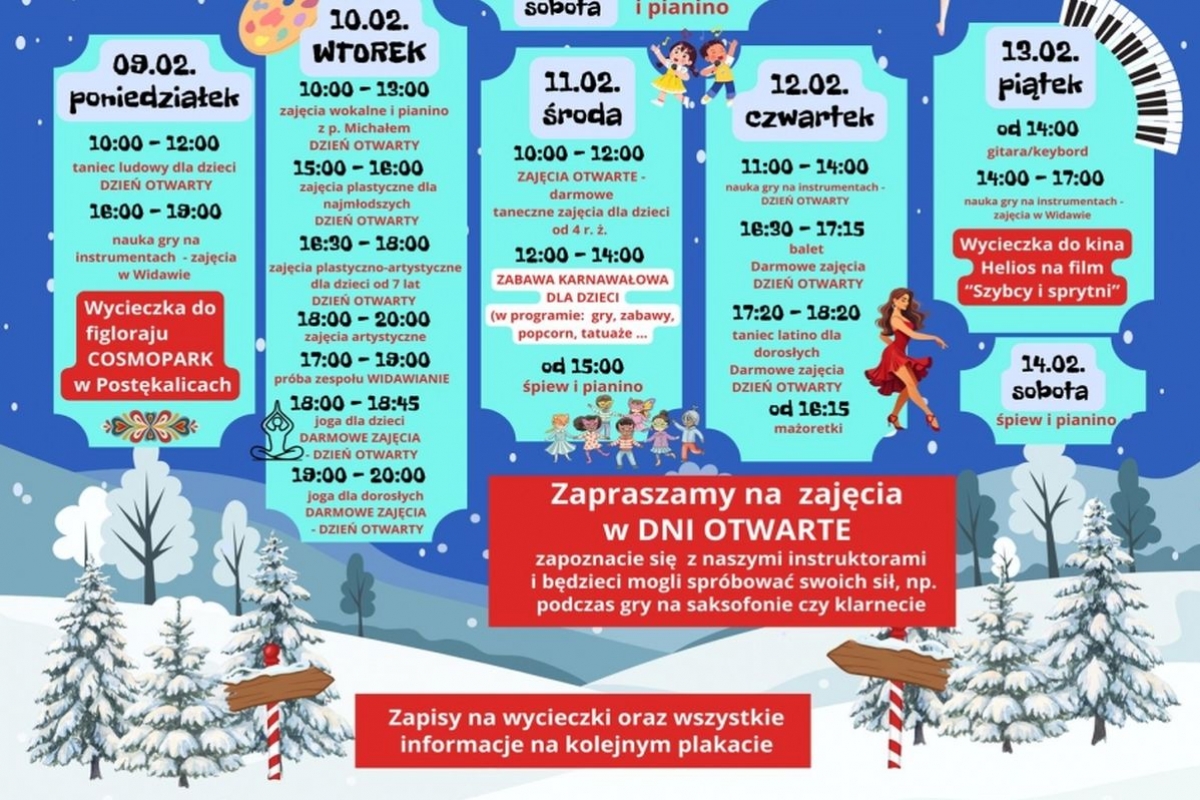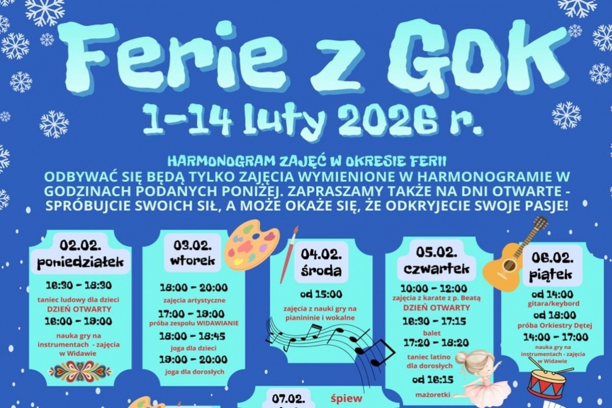 „Ferie z GOK Widawa” to doskonała okazja do rozwijania pasji, poznawania nowych umiejętności i spędzenia wolnego czasu w gronie rówieśników. Organizatorzy już dziś zapraszają do udziału i wspólnego tworzenia niezapomnianych ferii zimowych.