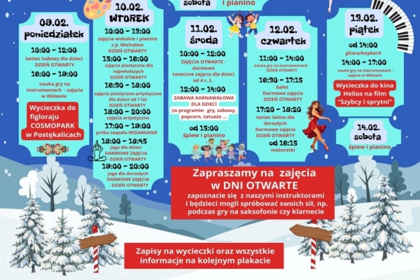 W programie przygotowano bogaty wybór zajęć artystycznych i rekreacyjnych. Uczestnicy będą mogli spróbować swoich sił m.in. w grze na klarnecie i saksofonie, ćwiczeniach jogi, treningach karate, a także wziąć udział w licznych warsztatach i animacjach. Nie zabraknie również wycieczek, które pozwolą oderwać się od codzienności, oraz zabawy karnawałowej, gwarantującej mnóstwo radości i dobrej energii. Organizatorzy podkreślają, że każdy znajdzie coś dla siebie – niezależnie od zainteresowań.