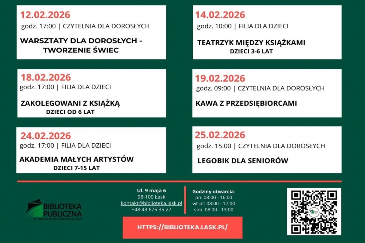 Przedstawiamy harmonogram wydarzeń Biblioteki Publicznej na luty 2026 roku. Nadchodzący miesiąc wypełniony będzie różnorodnymi inicjatywami przygotowanymi z myślą o czytelnikach. W programie znajdują się m.in. spotkania autorskie, warsztaty, zajęcia edukacyjne oraz wydarzenia kulturalne.