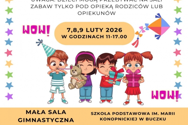 Informujemy iż Gminny Ośrodek Kultury i Sportu w Buczku przygotował niespodziankę dla najmłodszych. W czasie ferii zimowych, w dniach 7–9 lutego 2026 r. (sobota–poniedziałek), na dzieci czekać będą dmuchańce dostępne w sali gimnastycznej Szkoły Podstawowej im. Marii Konopnickiej w Buczku. Wstęp wolny.