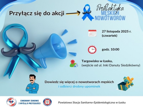 Z okazji trwającej corocznej, międzynarodowej kampanii społecznej #Movember, której celem jest zwiększanie świadomości na temat męskiego zdrowia serdecznie zapraszamy 27 listopada 2025 r. od godziny 10:00 do wspólnego świętowania. Miejsce: Targowisko w Łasku (wejście od ulicy Inki Danuty Siedzikówny – naprzeciwko szkoły)