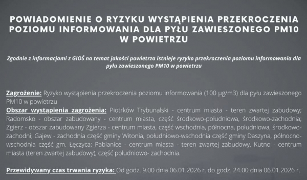 Powiadomienie o ryzyku wystąpienia przekroczenia poziomu informowania dla pyłu zawieszonego PM10 w powietrzu.