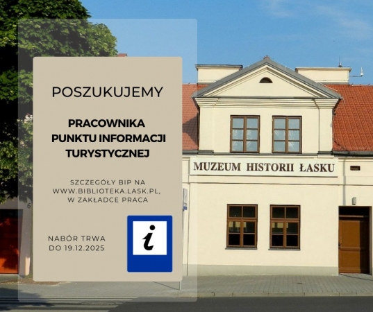 Szukamy osoby do pracy w Punkcie Informacji Turystycznej w Łasku! Lubisz ludzi, znasz swoje miasto i chcesz pracować w miejscu, gdzie każdy dzień jest inny? Dołącz do naszego zespołu w Bibliotece Publicznej w Łasku i zostań ambasadorem Łasku i regionu
